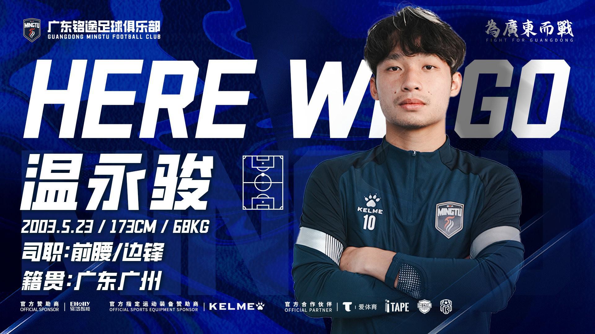 广东铭途足球俱乐部基于对赛季发展方向的整体规划,并与球员本人充分沟通协商,双方达成一致:球员温永骏即日起正式转会至广东铭途足球俱乐部一线队!