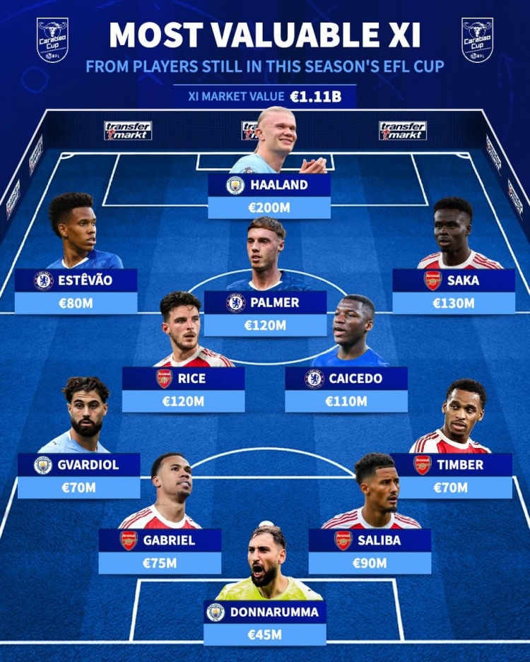 1月13日讯 足总杯第3轮已经完赛,《转会市场》也列出了仍未出局的球员最贵阵,阿森纳5将在列、切尔西曼城各3人。足总杯仍未出局最贵阵:总身价11.1欧元前锋:埃斯特旺(切尔西,8000万)、哈兰德(曼城,2亿)、萨卡(阿森纳,1.3亿)中场:赖斯(阿森纳,1.2亿)、帕尔默(切尔西,1.2亿)、凯塞多(切尔西,1.1亿)后卫:格瓦迪奥尔(曼城,7000万)、...